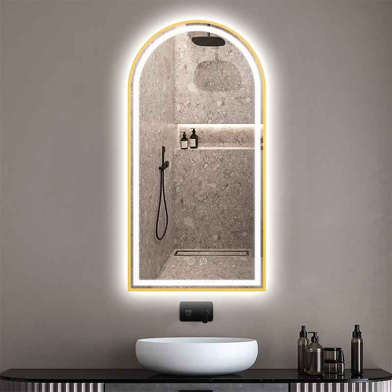Oglinda Fluminia, Gaudi Gold, este o oglindă pentru baie cu iluminare LED și funcție de dezaburire, cu o formă inspirată din stilul spaniol – un arc rotunjit, care amintește de arcadele caracteristice arhitecturii iberice. Numele colecției face trimitere la Antoni Gaudí, arhitectul catalan cunoscut pentru formele organice și curbate, iar silueta oglinzii reflectă tocmai această estetică rafinată. Rama din aluminiu cu finisaj gold îi conferă un aspect cald și elegant, care se integrează ușor în decoruri moderne sau clasice. Dispune de două tipuri de iluminare LED: iluminare internă, pentru o vizibilitate clară în fața oglinzii, și iluminare ambientală perimetrală, care se difuzează blând în jurul oglinzii.