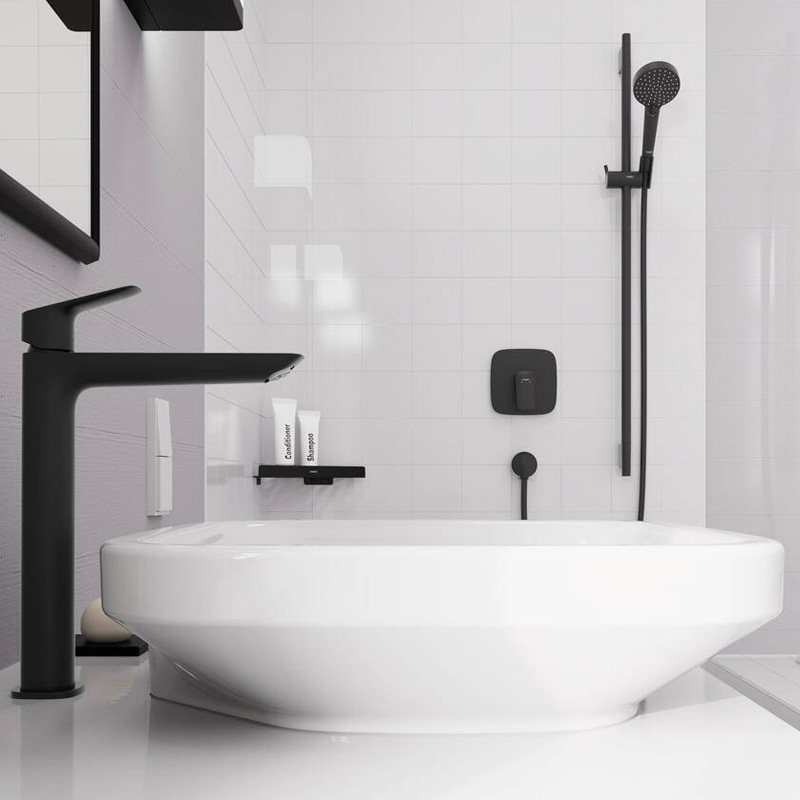 Bateria Hansgrohe Logis 240 Fine este ideală pentru băi moderne și minimaliste. Finisajul negru mat o face o alegere perfectă pentru a crea un contrast elegant cu pereții albi sau cu alte culori deschise. Bateria este ușor de utilizat și de curățat, fiind o soluție practică și durabilă pentru orice baie.