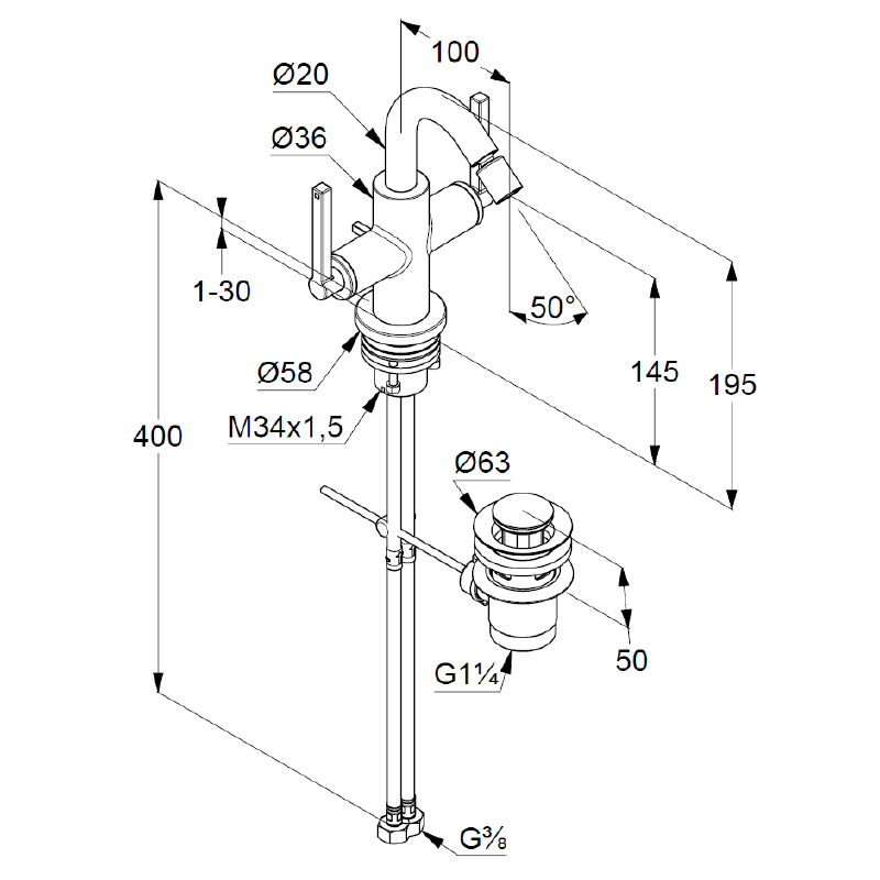 - înălțime între baza bateriei și punctul de curgere a apei: 14,5 cm
