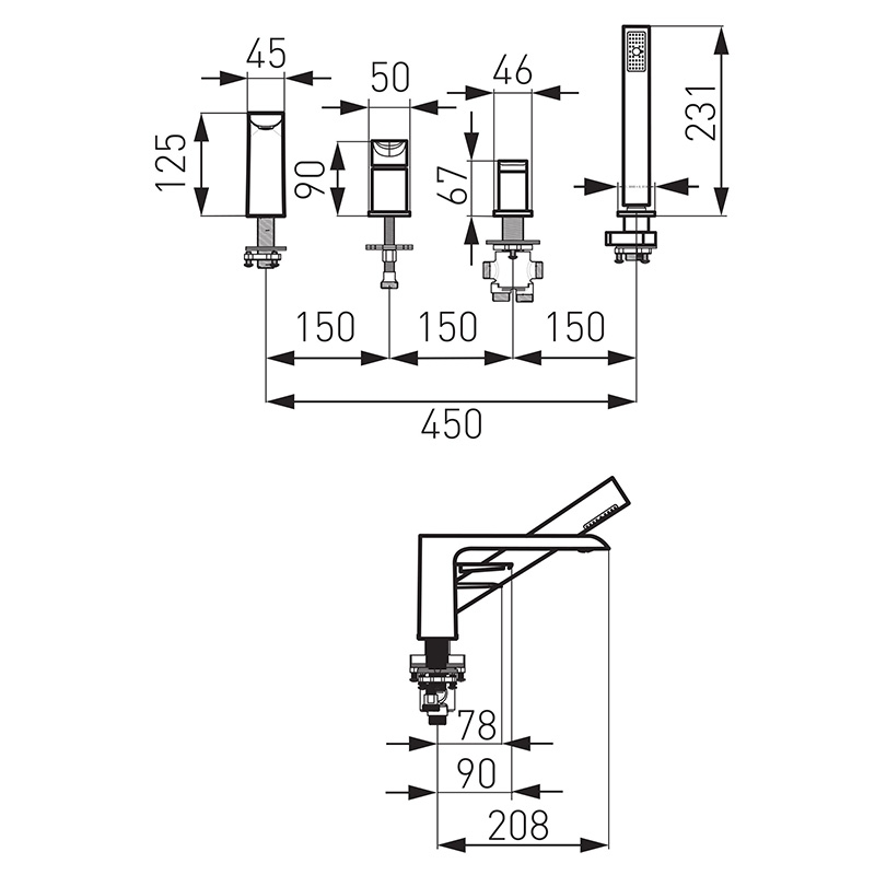 Baterie cadă-duș cu 3 elemente, Kludi, Ameo, montaj pe cadă, crom