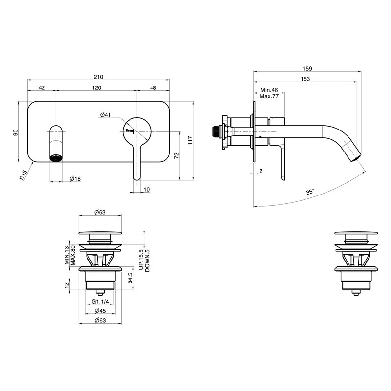 Baterie pentru lavoar FIMA Carlo Frattini, montaj pe perete, ventil CLICK-CLACK, crom