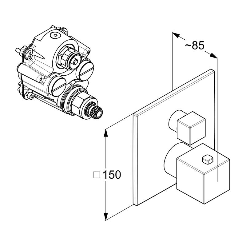 Produsul KLUDI DECUS este un set de finisaj pentru un comutator încastrat cu trei căi, destinat controlului a trei consumatori diferiți (de exemplu, duș de mână, duș fix și cadă).