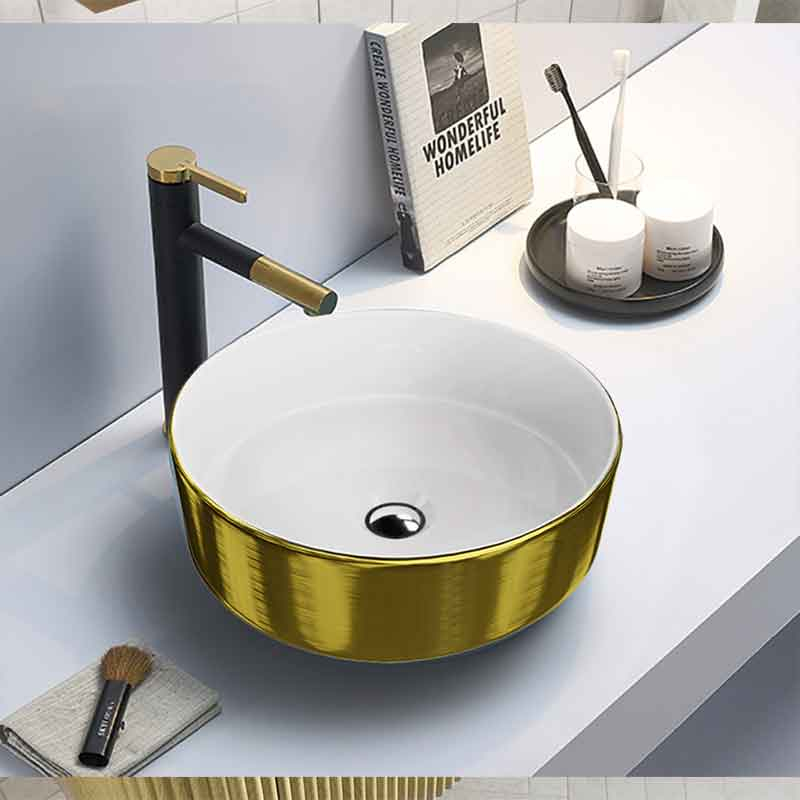Realizat din ceramică cu finisaj alb lucios la interior și auriu periat la exterior, lavoarul combină estetica luxuriantă cu funcționalitatea. Suprafața netedă este ușor de curățat, rezistentă la uzură și își păstrează strălucirea în timp.