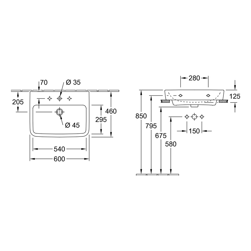 Lavoar suspendat, Villeroy & Boch, O.Novo, dreptunghiular, 55 cm, alb