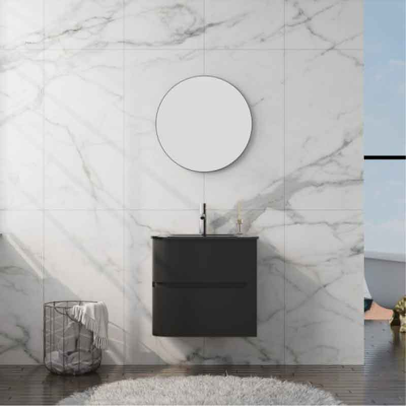 Acest mobilier de baie modern este conceput pentru a valorifica spațiul disponibil, oferind în același timp un aspect elegant și echilibrat. Designul cu colț rotunjit permite amplasarea piesei în zone mai greu de folosit, fără a sacrifica funcționalitatea sau estetica. Finisajul negru mat adaugă o notă rafinată, potrivită pentru băi moderne și minimaliste.