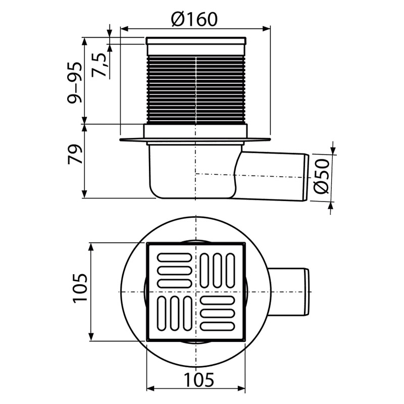 Sifon de pardoseala cu iesire laterala, Alcadrain, gratar din otel inoxidabil, 105x105/50 mm Alca, Cehia